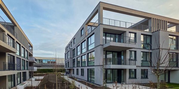 Das frei­ste­hende Haus im Garten schafft mit vier weiteren Wohnungen und privaten Gärten auf der Südseite einen Ruhepol im Grünen.