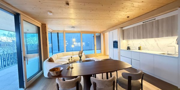 Die stilvolle 4,5‑Zimmer-Wohnung im zweiten Obergeschoss mit Aufzug besticht durch einen klar strukturierten Grundriss, hochwertige Ausstattungsdetails und ein Wohnambiente, das sofort Wohlgefühl erzeugt. Mittelpunkt ist der großzügige Wohn‑, Ess- und Kochbereich mit weitläufigen Fensterfronten und einer neuen, exklusiven Einbauküche samt eleganter Kochinsel. Die sonnige, überdachte Loggia erweitert den Wohnraum harmonisch – ideal für ein Essen im Freien, entspannte Abendstunden oder eine kurze Auszeit an der frischen Luft. Das helle Schlafzimmer mit Bad en suite, ausgestattet mit Wanne und Doppelwaschbecken, schafft einen privaten Rückzugsort. Zwei weitere lichtdurchflutete Zimmer bieten vielseitige Nutzungsmöglichkeiten – ob als Kinderzimmer, Gästezimmer oder komfortables Homeoffice. Ergänzt wird das Raumangebot durch ein modernes Duschbad sowie einen praktischen Abstellraum mit Platz für die Waschmaschine.